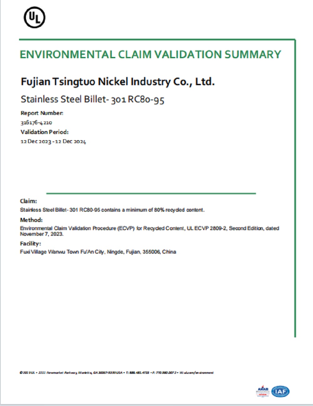 近日,青拓集团子公司福建青拓镍业有限公司、福建青拓实业股份有限公司、福建青拓科技有限公司,获得由苏州UL美华认证有限公司颁发的UL2809再生料含量认证证书。本次证书的获取是公司积极践行绿色发展理念的有力展现,也是公司推动可持续发展的具体实践。